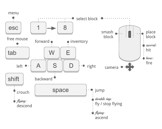 1. walk 2.chop trees 3. pickup items 4. use inventory and crafting 5. eat and heal yourself 6. build 7. drink potions 8. explore the infinite world 9. be happy bcs. the game runs even on your slow dusty crusty pc 10. jump 11. sprint 12. crouch 13. use pause menu 14. use minimap 15. kill monsters 16. use items 17. use creative mode 18. be in menu for 2 hrs. and listen to our soundtrack 19. flex on others that you are og 20 change skins that you can get only by doing tasks [there are no micro payments] 21. upgrade your character 22. dress up some new armor 23. sleep 24. build house in nowhere 25. blow everything up with tnt 26. dig some trenches with showel and simulate the world war one 27. use traps to kill those dumb ai zomies that barely can jump. 28... are you still there? i'm bored of texting this... just wait to December, and play the game for price of one whooper or 12 McChickens :0.
